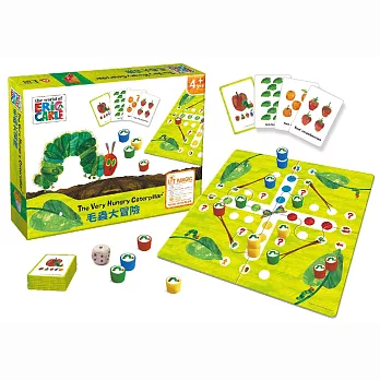 艾瑞?卡爾書中「好餓的毛毛蟲」,第一天吃了一個蘋果,第二天吃了兩個梨子,第三天吃了三個李子…一口接一口、不停地吃吃吃,肥嘟嘟的。透過好玩的骰子遊戲與食物牌卡,讓自己的3隻毛毛蟲邊吃邊前進,當毛毛蟲停留在小樹葉上,還可以經過飛天樹枝快速移動,兩隻或三隻毛毛蟲停留在同一點時,還可以一起前進,看誰的毛毛蟲最快變蝴蝶。